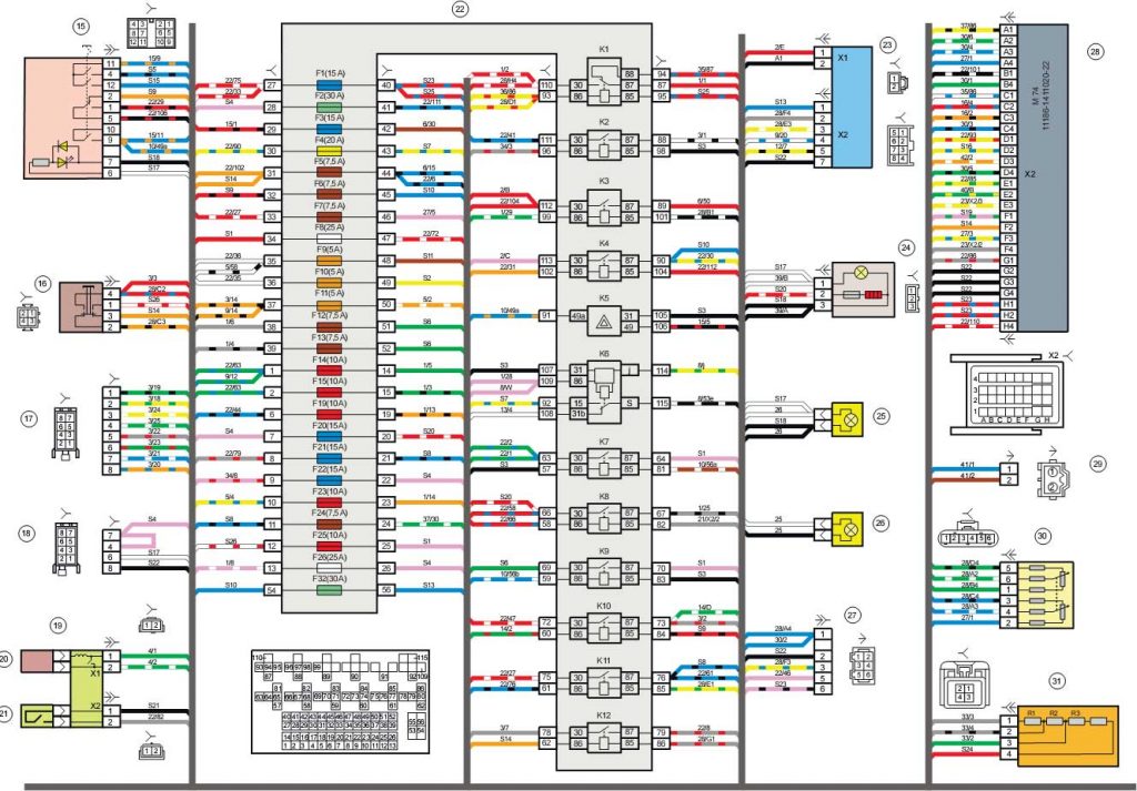 - 29 – входящий разъем на заднюю часть бортовой сети;