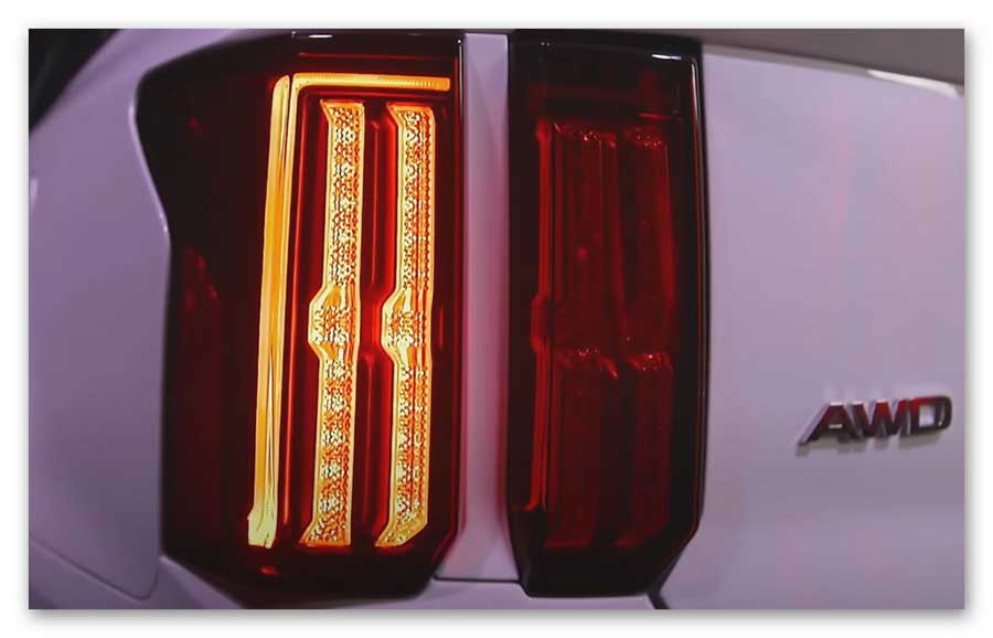 - необычная форма вертикальных и одновременно узких задних фонарей красного цвета в стиле Kia Telluride (всего четыре элемента), но между ними нет соединительной декоративной планки, которая сейчас в моде;