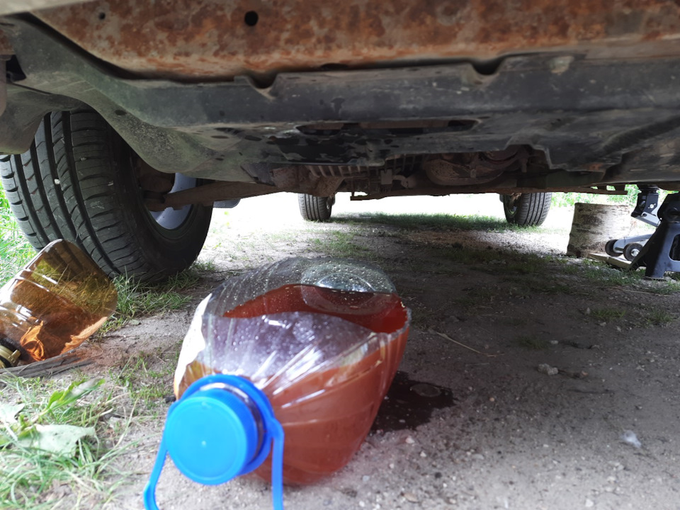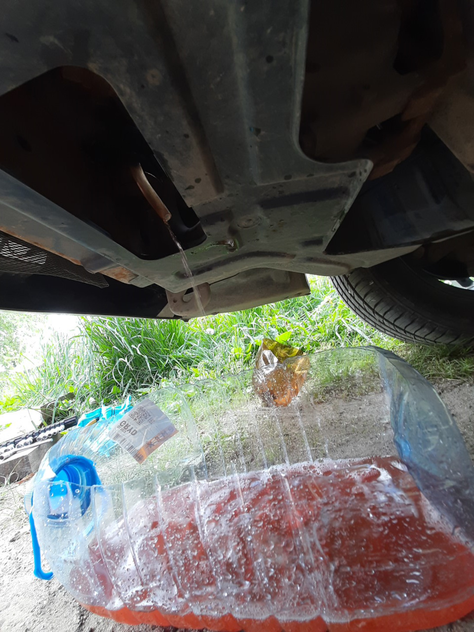 - Подставляем тару – сливаем до остатка отработанный антифриз. Время слива – до 20 минут.