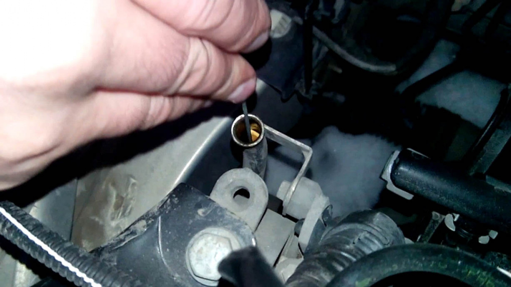 Возле блока цилиндров располагается щуп. В большинстве моделей автомобилей он выделяется ярким цветом, поэтому перепутать или не найти его сложно. Измерительный прибор аккуратно вынимается из гнезда — дёргать его не нужно, чтобы не сломать, иначе придётся покупать новую деталь, а стоит она немалых денег;
