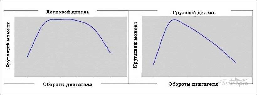 Как можно увидеть, у грузового ДВС нет выраженной «полки» момента. Это сделано неспроста. Для таких авто важен пик тягового усилия, когда ему нужно тронуться с места и набрать скорость. Дальше этот показатель не так важен – в ход идут лошадиные силы. Разогнавшись, грузовик лишь поддерживает заданную скорость. «Размазав» полку тягового усилия как у легкового ДВС, не получится нормально тронуться с места груженым.