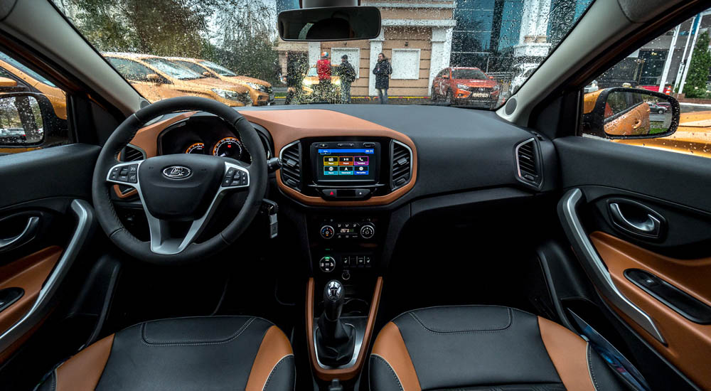 Дизайн салона основывается на гармоничной комбинации двух цветов, черного и оранжевого. В отличие от автомобиля-предшественника, Lada Xray Cross 2019 обзавелась регулируемым по вылету рулем.