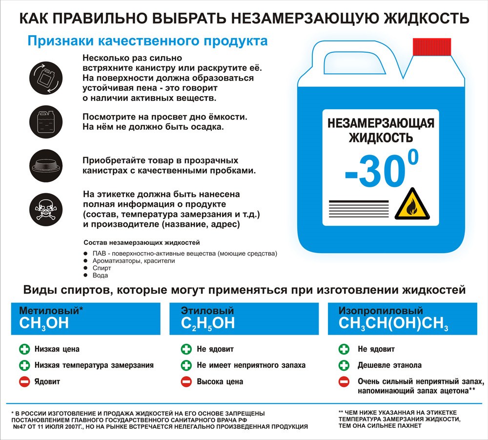 Незамерзающая жидкость — незаменимый атрибут безопасного вождения. Потому не стоит приобретать её на обочине дороги, с рук, на рынке или в другом сомнительном месте. В противном случае возрастает риск купить продукцию низкого качества или средство на основе метилового спирта.