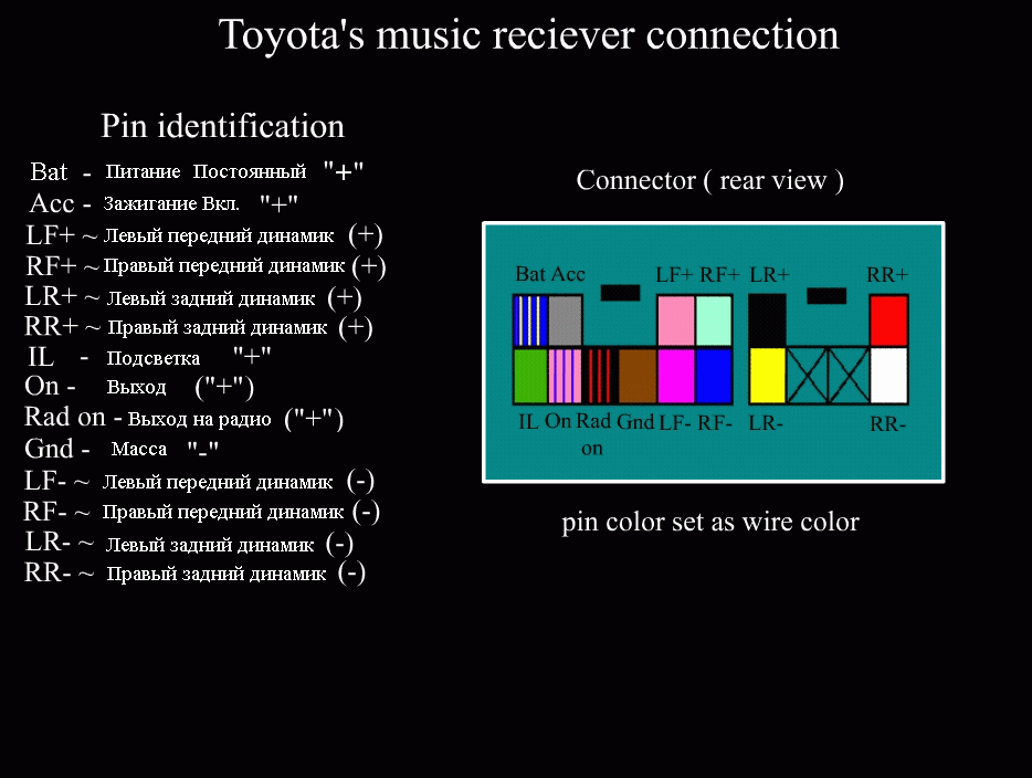 Базовая распиновка штатной магнитолы Toyota содержит следующие кабели: