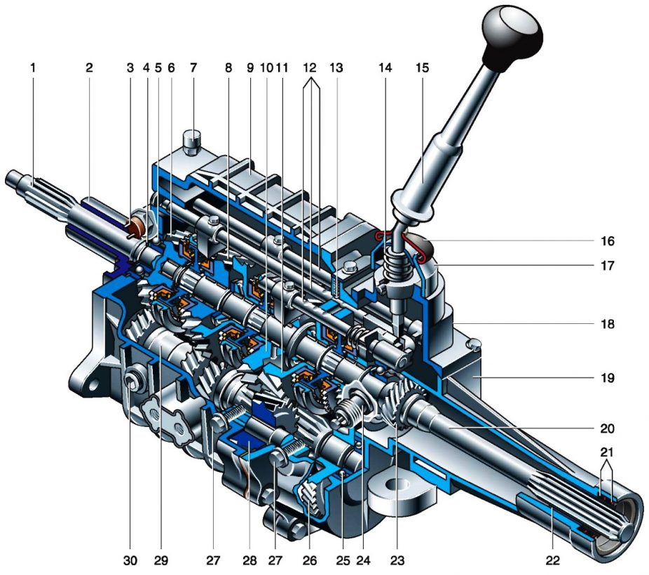 Ограничимся анализом наиболее распространенного вида механической коробки передач — двухвальной. Устройство механической коробки передач включает в себя следующие детали и узлы:
