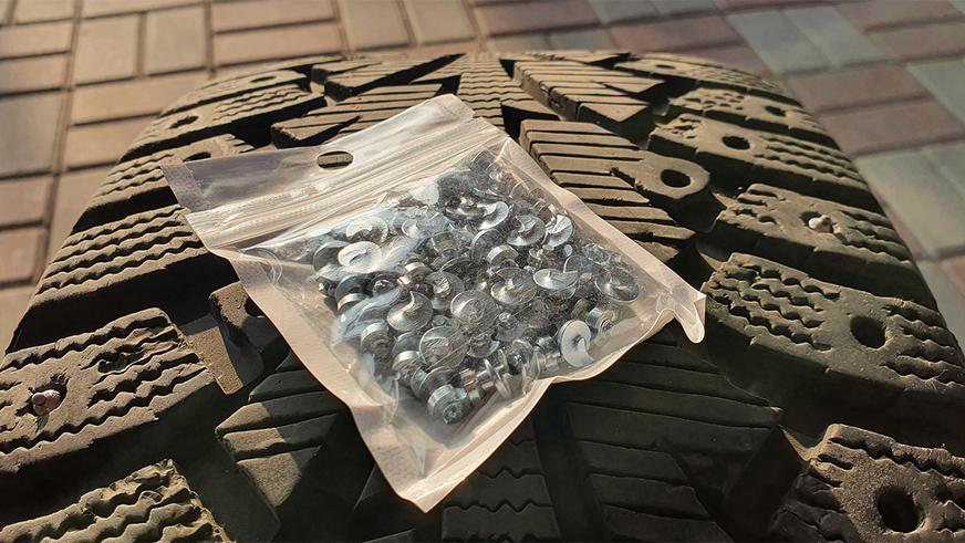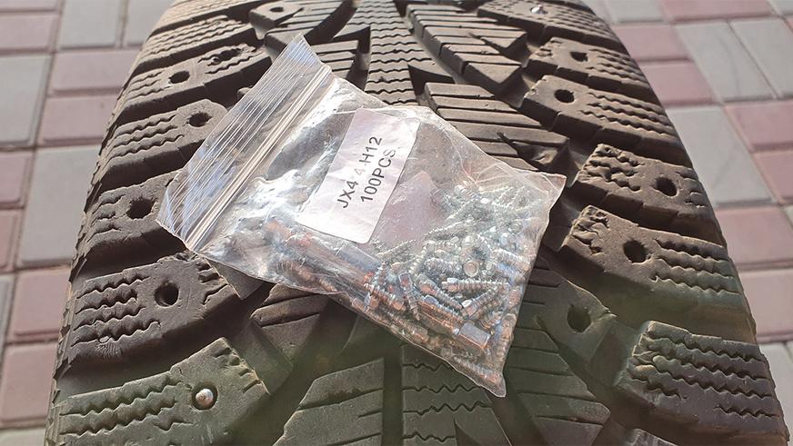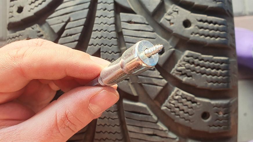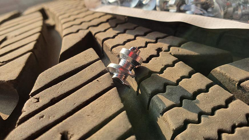 Для эксперимента мы приобрели два разных комплекта: одни можно вкручивать в старое посадочное место, другие «гвоздики» — в шашку шины.