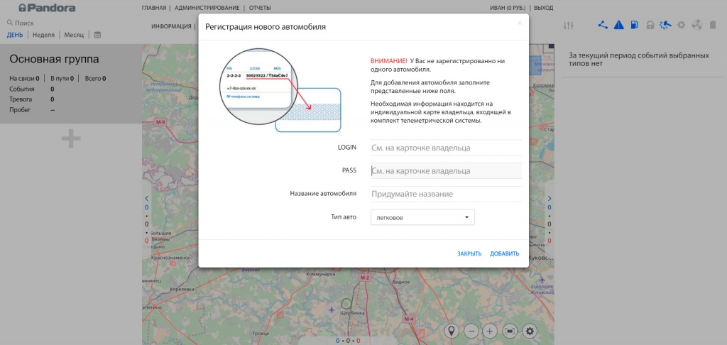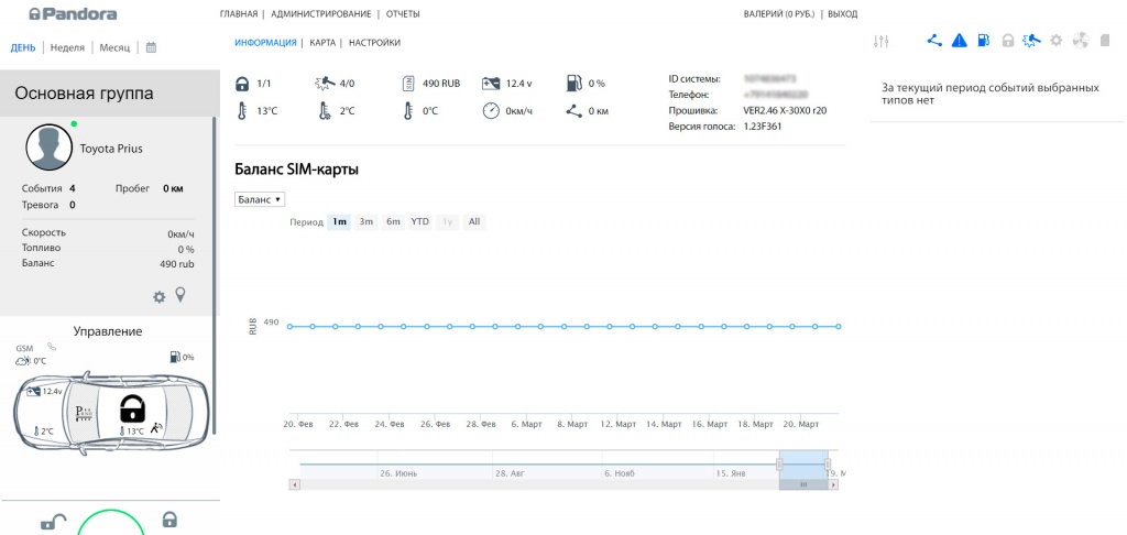 10. После успешного входа в систему, Вы увидите перед собой окно, где будут отображаться все текущие данные по авто и сигнализации.