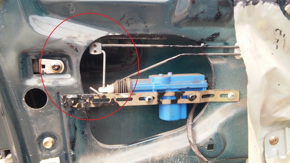 Когда обшивка на двери отсутствует, можно свободно отсоединить две тяги, идущие от дверной ручки к замку. Дальше показано, о каких именно элементах идёт речь.