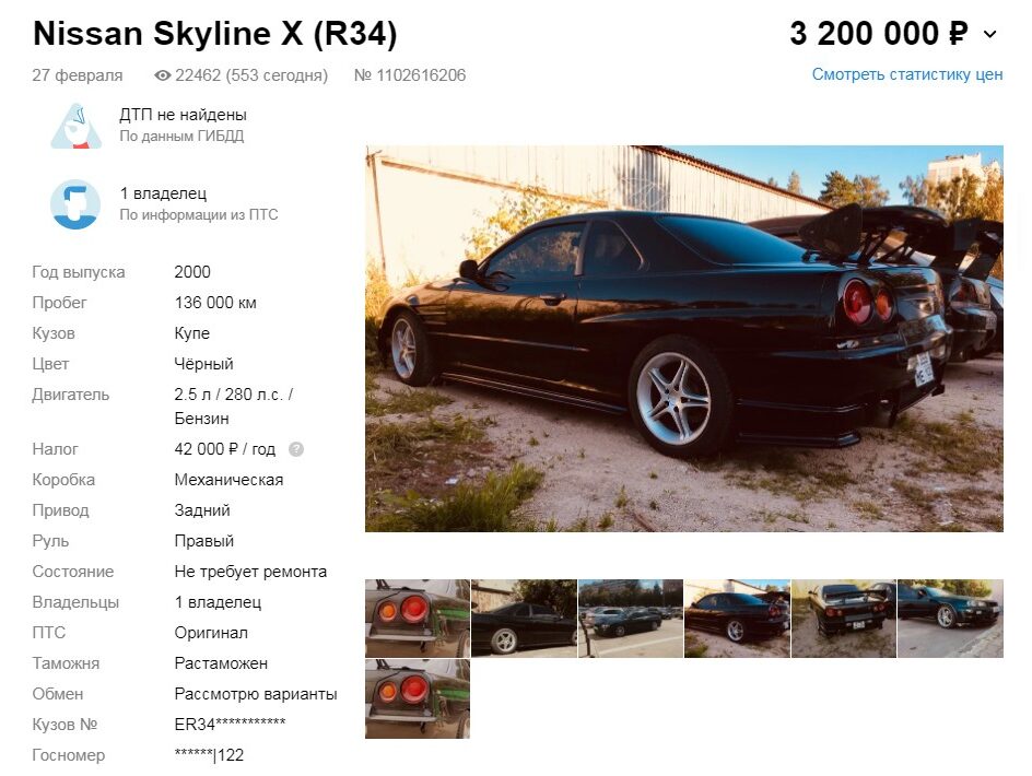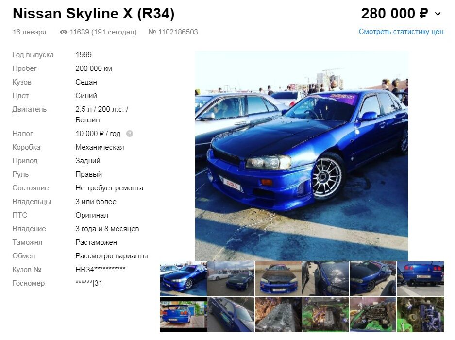 | Nissan Skyline R34 | 1999 | 800 000 рублей |