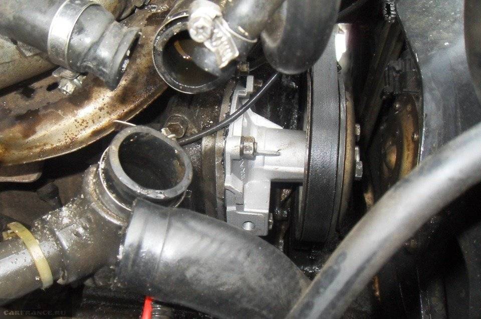 2. Демонтировать патрубки, идущие к термостату и помпе; 3. Открутить 3 гайки крепления вентилятора охлаждения; 4. Отпустить 3 болта крепления крыльчатки помпы плоским ключом на 13