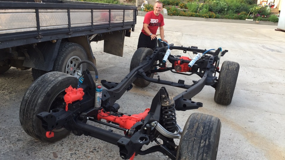 Напомню, как выглядит снизу обычный Mitsubishi Pajero второго поколения. Прежде всего это рамный автомобиль, спереди у него двойные поперечные рычаги и торсионы, а сзади жесткая балка моста. Что от этого сохранил Pajero Evolution? Только раму! Шасси полностью оригинальное — с пружинами спереди и многорычажной схемой сзади. Вот только где-то я уже видел такой нижний поперечный рычаг и длинную продольную тягу. Точно — так же устроены подвески у обычных Pajero третьего и четвертого поколений! Я ведь сам пять лет проездил на «третьем» коротыше, а сейчас такой автомобиль по случайному стечению обстоятельств оказался на полигоне. Сравниваем! Длина задних рычагов идентична — 510 мм, только на Evo они явно выполнены по обходной технологии и выглядят далеко не так массивно. А еще продольный рычаг у Pajero III хоть и крепится в аналогичных точках, но стал более простым по форме — на Evo он закручен хитрее. Спереди ситуация еще интереснее. Рычаги на Pajero III немного длиннее — 560 мм против 530 мм, однако балка, к которой они крепятся, короче на 60 мм. То есть суммарная длина этих деталей получается такой же, как на Pajero Evo.