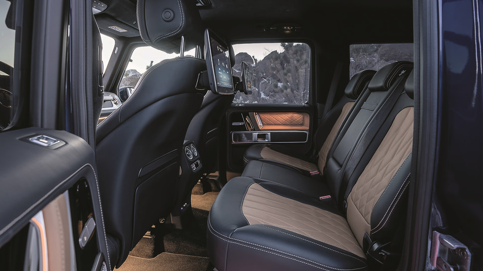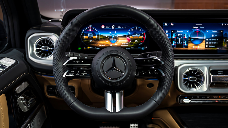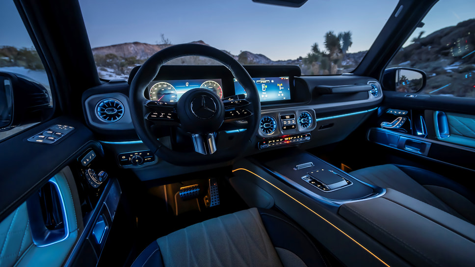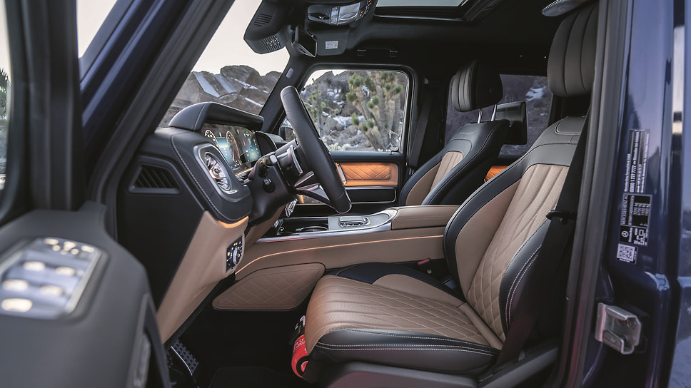 Интерьер базируется на актуальном G350d в кузове W464. Дорожный просвет вырос по сравнению с базовым Геликом на 10 мм и теперь составляет 246 мм, соответственно выросли и углы заезда/съезда и теперь они составляют 39 и 36 градусов вместо 30 у базовой версии.