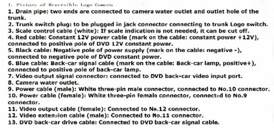Силовой провод камеры — соединяем с ответной частью под номером 10.10. Силовой провод камеры — соединяем с ответной частью под номером 9.11. Видео кабель — соединяем с ответной частью под номером 12.12. Видео кабель — соединяем с ответной частью под номером 11.13. Никакой это не бэк сигнал кабель. На него нужно просто подать плюс — это можно сделать на +12в магнитолы. Я так и сделал, просто скрутив этот провод с проводом под номером 4. Хотя, в теории, от бэк сигнала (плюса на фонаре зх) тоже будет работать.