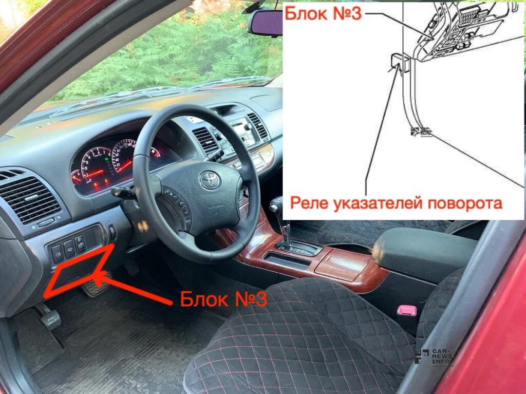 Блок №3 находится в передней части автомобиля слева от рулевой колонки в торпедо. Однако доступ к блоку закрывает декоративная пластиковая крышка. В свою очередь открыть ее очень просто, потянув на себя. Например расположение декоративной крышки можно увидеть на фото ниже. Кстати на этом фото есть схема на которой указано расположение реле указателей поворота, которое вынесено из блоков.