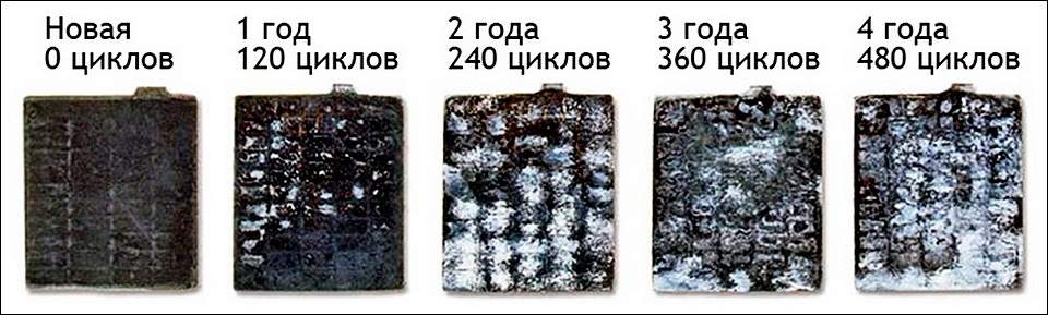Аккумуляторная батарея распространенного свинцово-кислотного типа состоит из пар электродных решеток, которые погружены в кислотную среду. Они находятся под ее постоянным влиянием, поэтому наблюдается необратимый процесс химического разрушения. Пластины постепенно покрываются сульфатом, а активная паста высыпается. По мере увеличения разрушений снижается емкость и уменьшается отдаваемый батареей ток. Срок службы АКБ, указанный производителем, актуален при идеальных условиях, то есть, при температуре 20 градусов и соблюдении режимов заряда-разряда. В реальности батарее приходится работать при морозах, смене влажности и даже при перегреве.