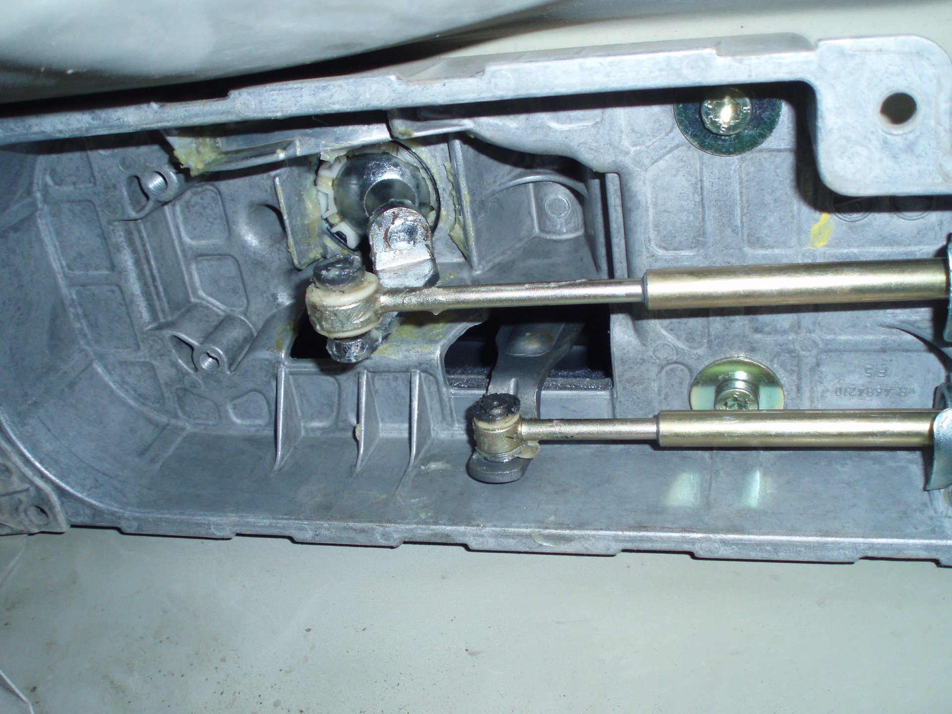я делал так, снял металические защелки с наконечников тросов, снял наконечники, выставил в нейтральное положение маятник , повернул уголок вверх, со стороны салона воткнул штырь фиксатор, накинул опять наконечники тросов + одел защелки, опустил уголок вниз, в салоне вытянул штырь .