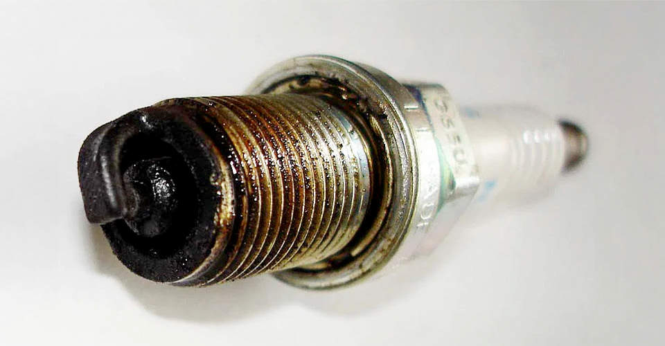 - При демонтаже залитой свечи зажигания ее резьба и электрод мокрый, в низу свечи, где вырабатывается искра, есть темный нагар.