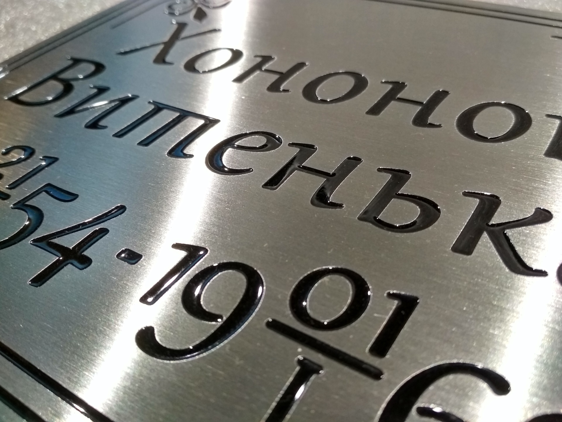 Надписи на нее наносят путем компьютерной (лазерной) гравировки, термопечати или фрезеровки. Но даже хороший металл требует регулярного ухода, чтобы хорошо выглядеть. Его не менее одного раза в год (а в условиях влажного климата и чаще) необходимо протирать специальными защитными составами.