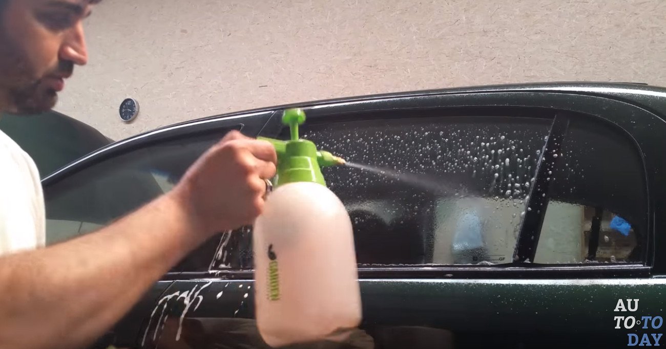 Моющее средство или же шампунь потребуется нам и для самого процесса тонировки. Подготовленный раствор заливается в пульверизатор. Теперь из него опрыскивается наружная часть вымытого заранее стекла.
