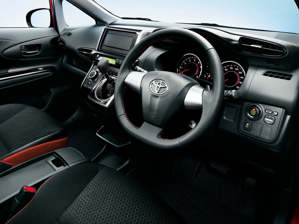 На широкие, короткие спицы руля Toyota нанесены декоративные алюминиевые накладки, в них встроены клавиши управления автозвуком и круиз-контролем, приборный щиток Wish укомплектован тремя крупными шкалами с черным полем заключенными в хромированную окантовку. Накрывающий щиток козырек переходит в обводы консоли включающей в свой состав вертикальные заключенные в хромированные рамки решетки воздуховодов. Между ними помещен дисплей мультимедийного комплекса. Под этими элементами установлена тумба с наклоненной под 50-градусным углом поверхностью. Она используется под компоновку селектора коробки передач, шайбы управления функциями мультимедийного комплекса, клавиш управления бортовыми системами. По бокам передней панели распределены регулируемые дефлекторы обдува.