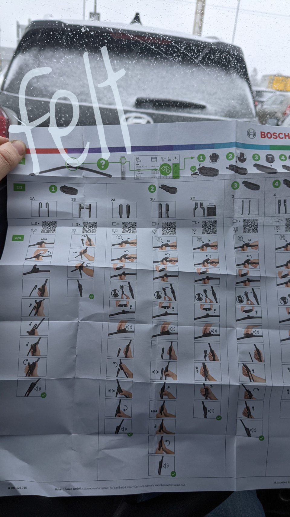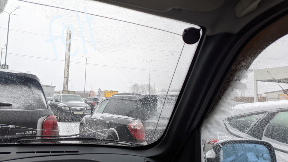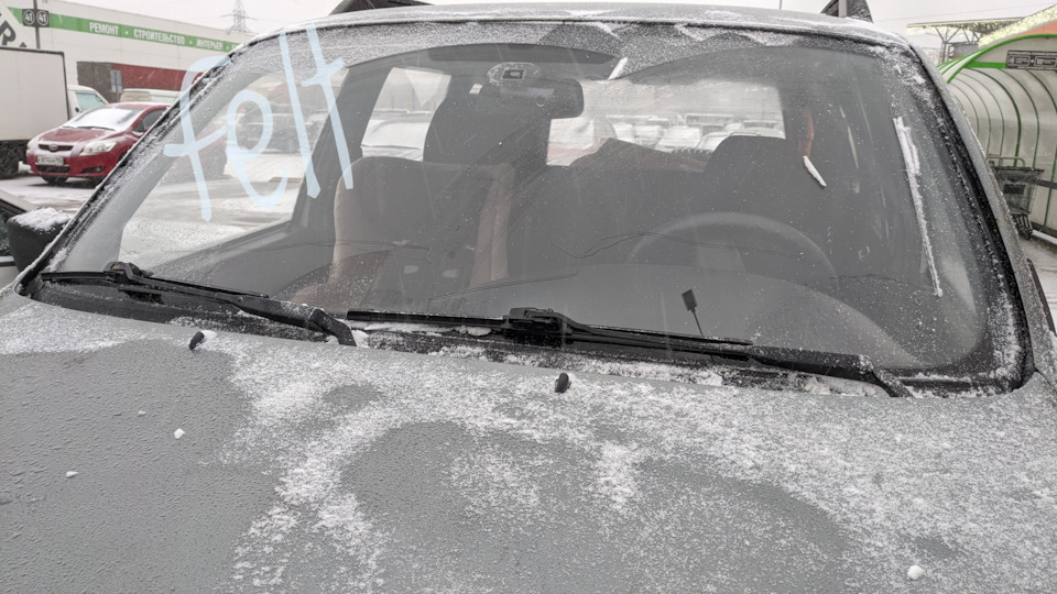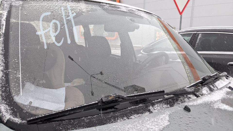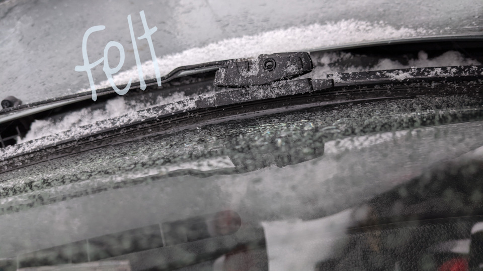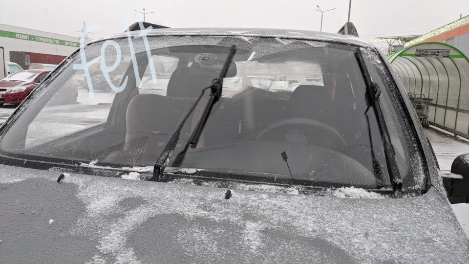 Сначала были установлены дворники по 41 см. Встали как родные, без проблем, чуть улучшился обзор, но было видно, что это не предел. Следующий размер, который удалось установить — 45 см (на фото). Это, похоже, максимум, но +7 сантиметров совсем не мелочь. При этом, на фото дворники еще не отрегулированы, а водительскую щетку в месте крепления к оси поворота стоит немного довернуть, таким образом чтобы в вертикальном положении она максимально подходила к стойке стекла и вычищала поверхность для обзора слева. Да, она после этого не так хорошо ложится в нижнее положение, но обзору это не мешает. Когда отрегулировал — снег уже кончился и так эффектно сфоткать очищаемую площадь уже не получилось бы.