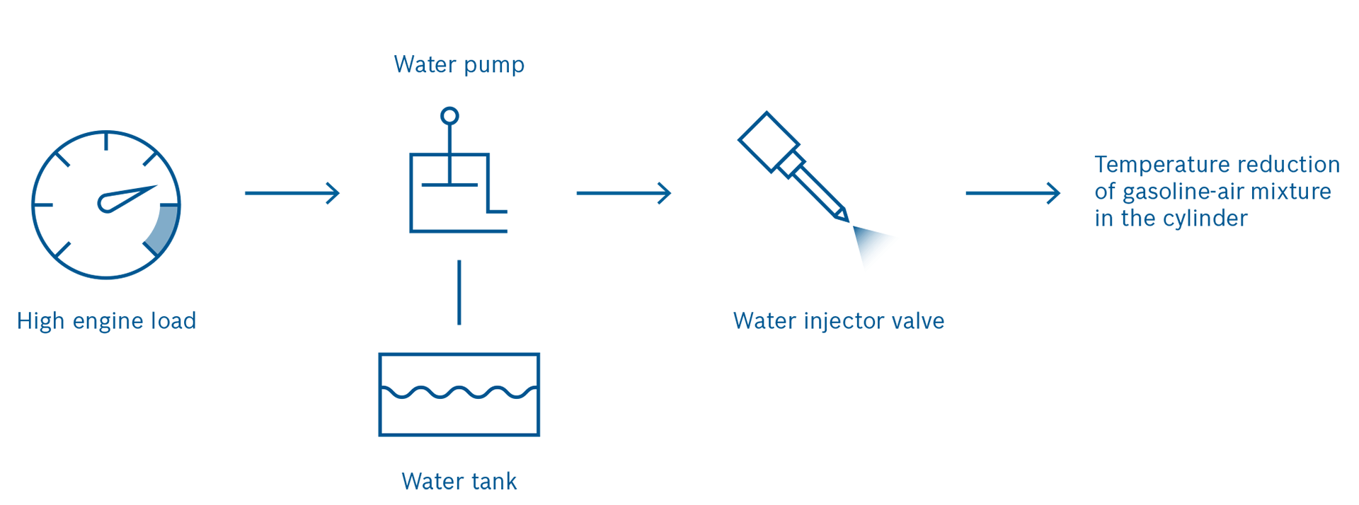 Bosch предлагает модифицировать систему впрыска топлива: использовать воду вместо бензина при охлаждении камеры. То есть суть технологии WaterBoost заключается в том, что на больших оборотах в двигателе задействуется водяная помпа, которая впрыскивает в камеру сгорания немного воды незадолго до поджига топливной смеси.