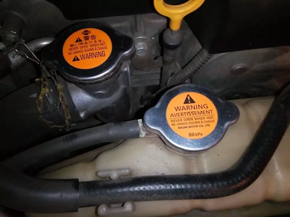 - Чтобы сбросить давление в системе охлаждения Инфинити ФХ, медленно поворачивайте крышку расширительного бачка против часовой стрелки. Если снять пробку быстро, то антифриз, находящийся под высоким давлением может обжечь руки и лицо водителя.