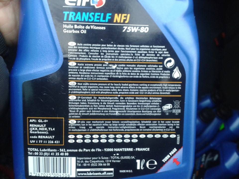 Так как какое конкретно масло залито неясно, пришлось перестраховаться и приобрести новое трансмиссионное масло Total Syn Fe 75W-90, масло рекомендовано Renault, застывает при температуре ниже 50 градусов.