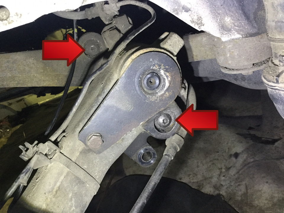 - Переходим к правой стороне, где откручиваем нижний крепеж стойки амортизатора ключами на 21. Способ показан на фото.