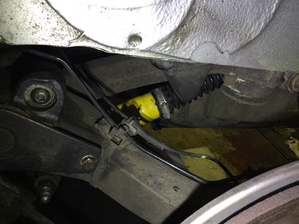 - Теперь отсоединим крепеж трубки с проводом датчика АБС.