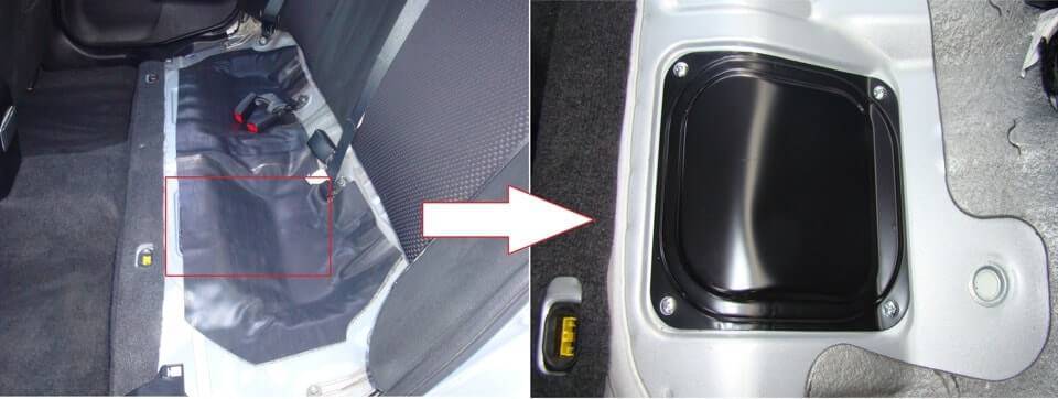 Открутите четыре крепления шумоизоляционной крышки, мешающей доступу к бензобаку, и снимите данный люк.