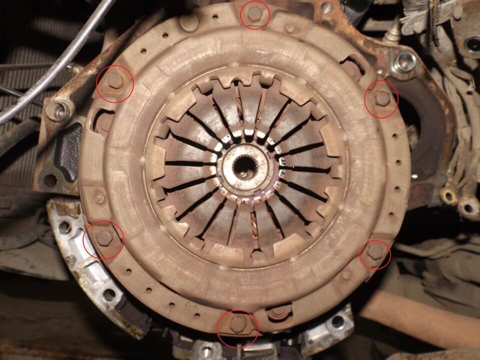 Отворачиваем 6 болтов крепления корзины сцепления. Отворачивать болты следует резким рывком, например с помощью торцовой головки и молотка. Устанавливаете ключ на головку болта и резким ударом по ключу, против часовой стрелки, срываете болт с места.