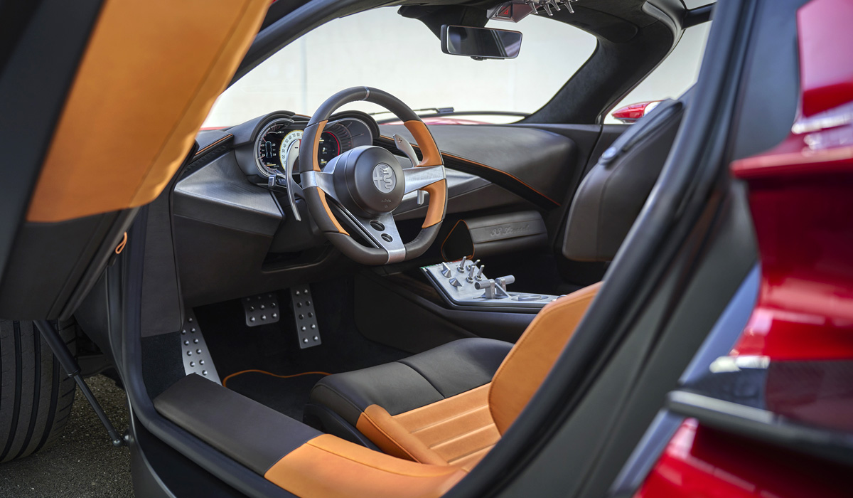 Alfa Romeo 33 Stradale 2024 остается двухместным спорткаром с установленным за спинами ездоков двигателем. Вариантов оформления салона предлагается два: сочетание кожи и алюминиевого декора (Tributo) либо алькантары и углепластика (Alfa Corse).