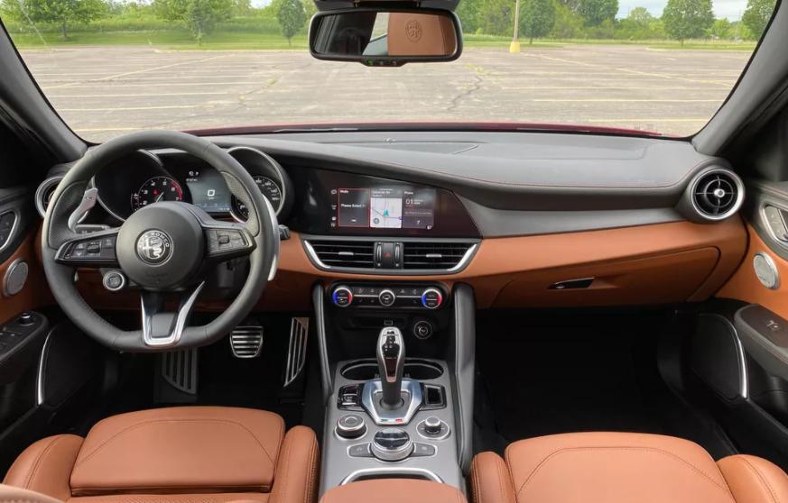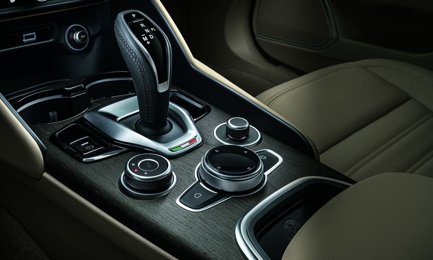 В 2020 году Giulia получила переработанную центральную консоль с обновленными материалами и новыми ручками, а рычаг переключения передач теперь обтянут кожей. Alfa заявляет, что у нее большие подстаканники и отсеки для хранения вещей, но на центральной консоли по-прежнему много неиспользуемого места, и есть только один порт USB (еще два под подлокотником).