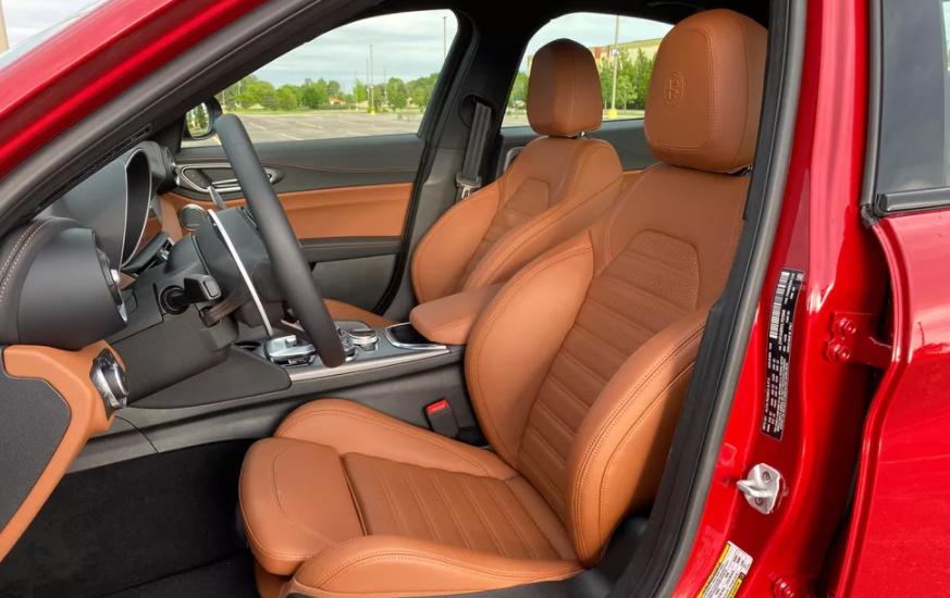 У этой Giulia есть пакет за 700 $, в котором верхняя панель приборов и дверные панели обтянуты кожей с контрастной строчкой.