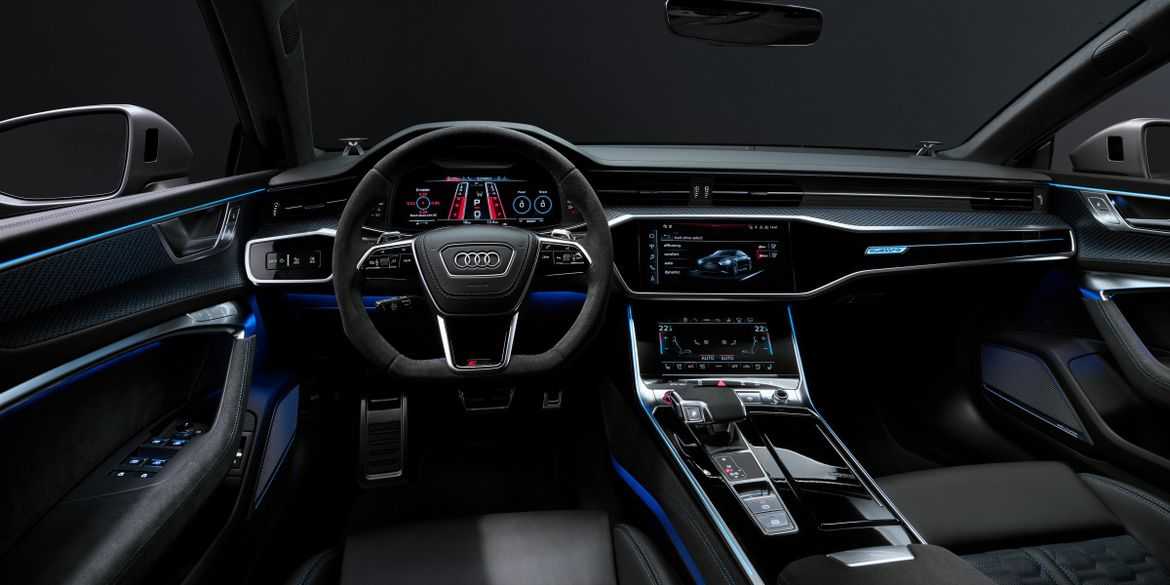 Среди отделочных материалов выделяется кожа, алькантара, а также декоративные вставки из карбона. У модификации Audi RS6 Avant Performance есть еще контрастная прострочка, выполненная синей или красной нитью.