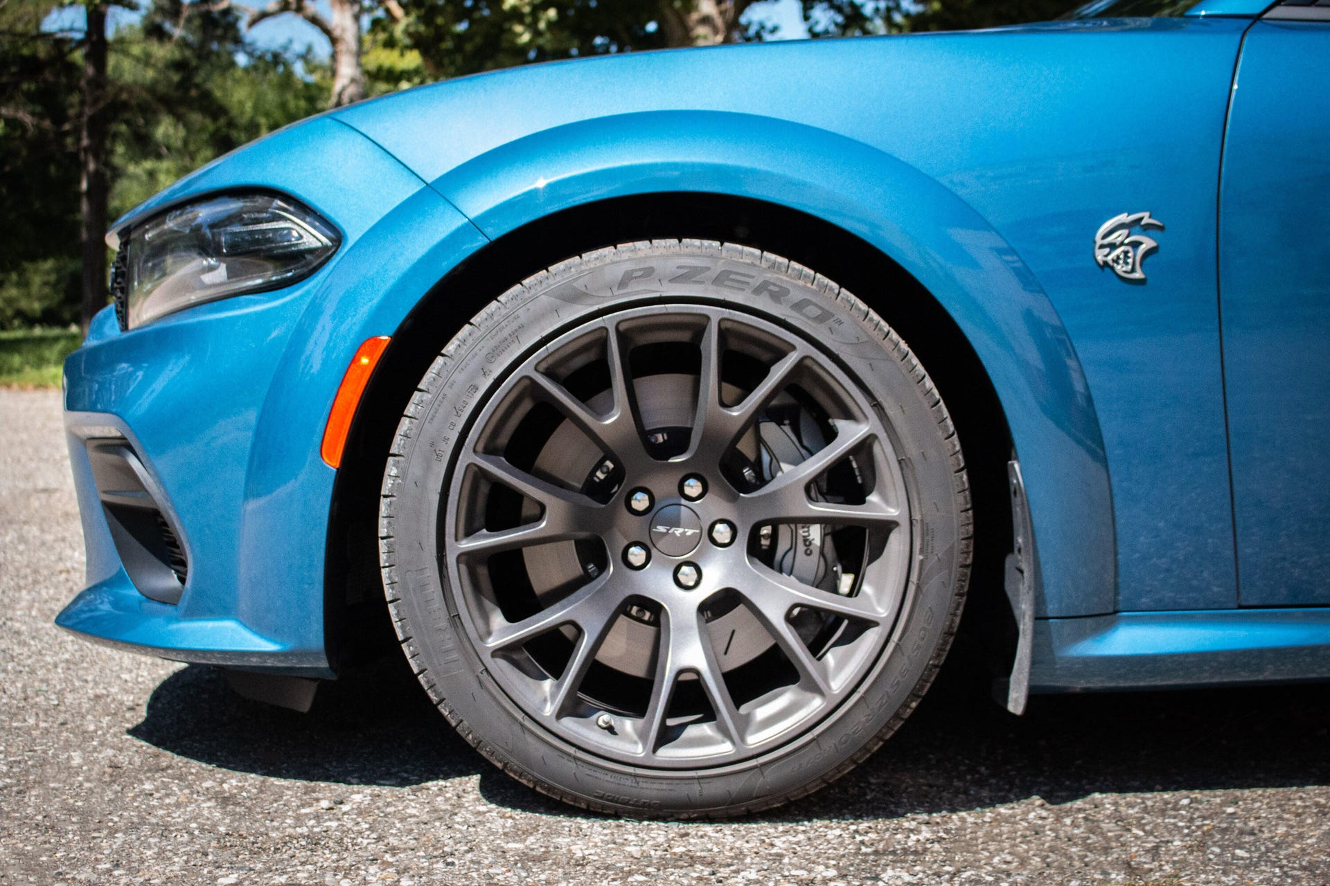 Besides a more hulking stance, the wider exterior shell allows for the installation of thicker wheels and tires. In the Hellcat’s case, the previously standard 20-by-9.5-inch wheels wrapped with 275/40-series tires are replaced by 20-by-11-inch wheels covered in 305/50-series rubber.