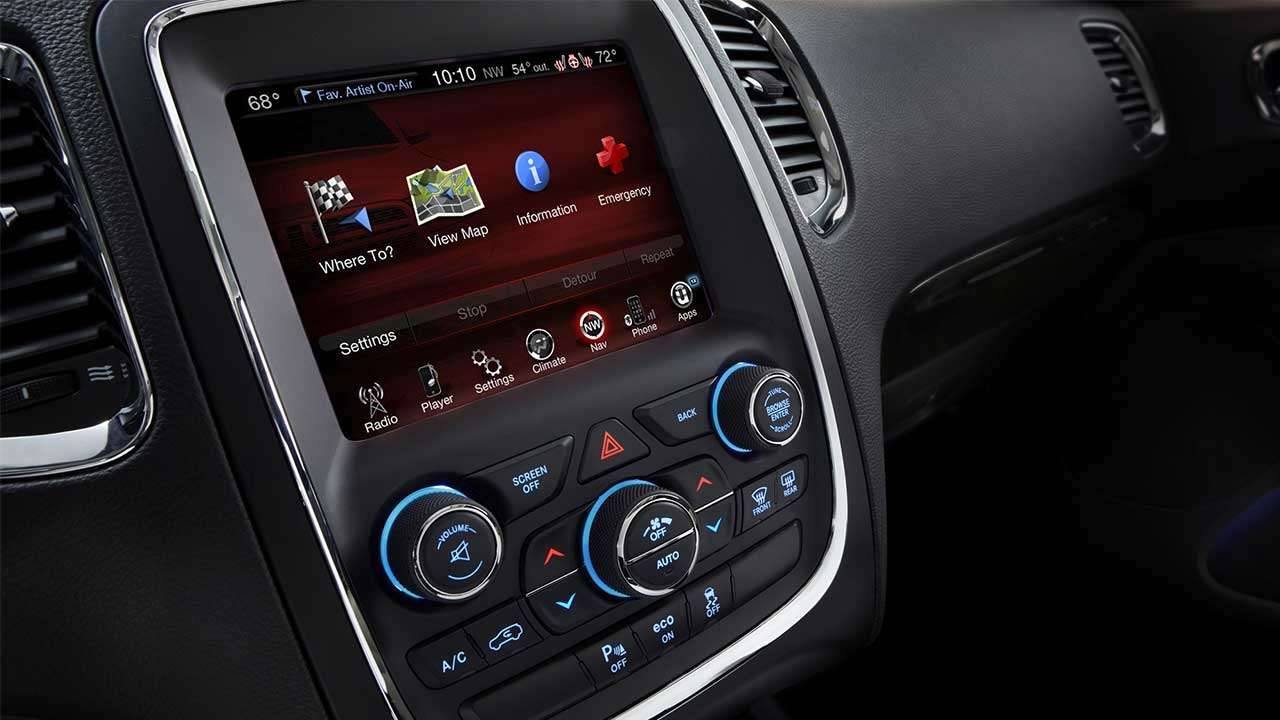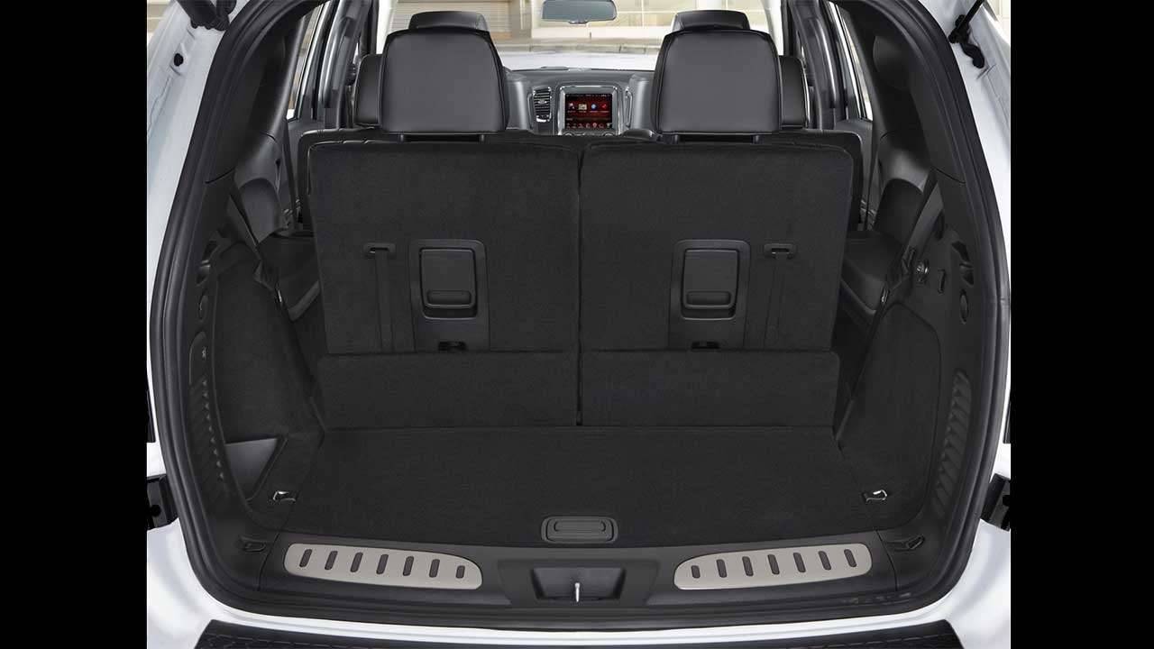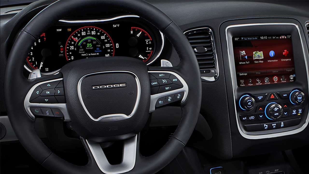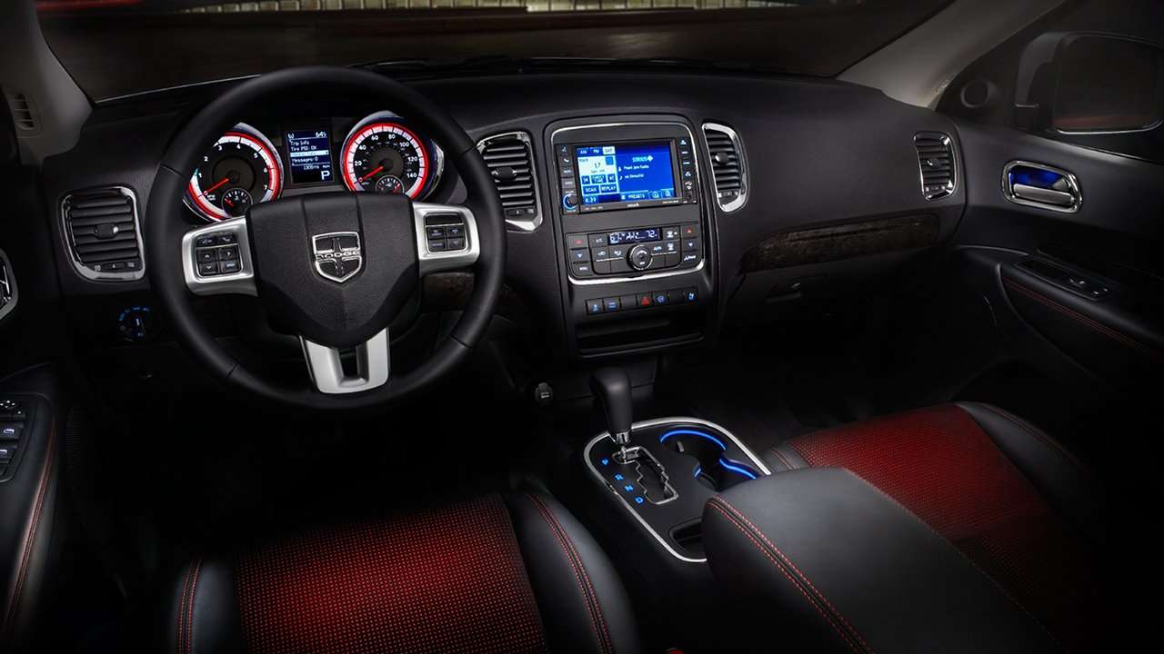 В стандартной конфигурации Durango имеет пять мест. Третий ряд является опцией для базовых моделей и стандартным для остальных комплектаций, увеличивая количество мест до семи. Помимо прочего, модели с тремя рядами можно заказать с капитанскими креслами второго ряда, но тогда количество мест уменьшается до шести. Сиденья первого и второго рядов подходят для длительных путешествий. Попасть на последний ряд легко, к тому же, он пригоден для размещения взрослых пассажиров. При желании сиденья можно дополнить подогревом и вентиляцией спереди и подогревом посередине. Вариантов обшивки немало. Качество отделочных материалов варьирует от удовлетворительного в моделях начального уровня и очень высокого в моделях высшей комплектации. Между тем, почти десятилетие без обновлений не пошло на пользу, соперники имеют более современный и изысканный дизайн. Списывать внедорожник со счетов не стоит. Модели 2020 гарантируют легкую в использовании информационно-развлекательную систему Uconnect. Сенсорный экран имеет от 7.0 дюймов в базовых до 8.4 дюймов в топовых моделях. В качестве альтернативы сенсорной поверхности предлагаются обычные кнопки. Приложения Android Auto и Apple CarPlay входят в базу всех Durango. Для разнообразия можно рассмотреть аудиосистему «Harman Kardon» на 19 динамиков, развлекательную DVD систему и спутниковое радио. Грузовой объем составляет 481 литр позади третьего ряда, сложив его можно рассчитывать на 1217 литров. Максимальный объем ограничивается 2407 литрами.