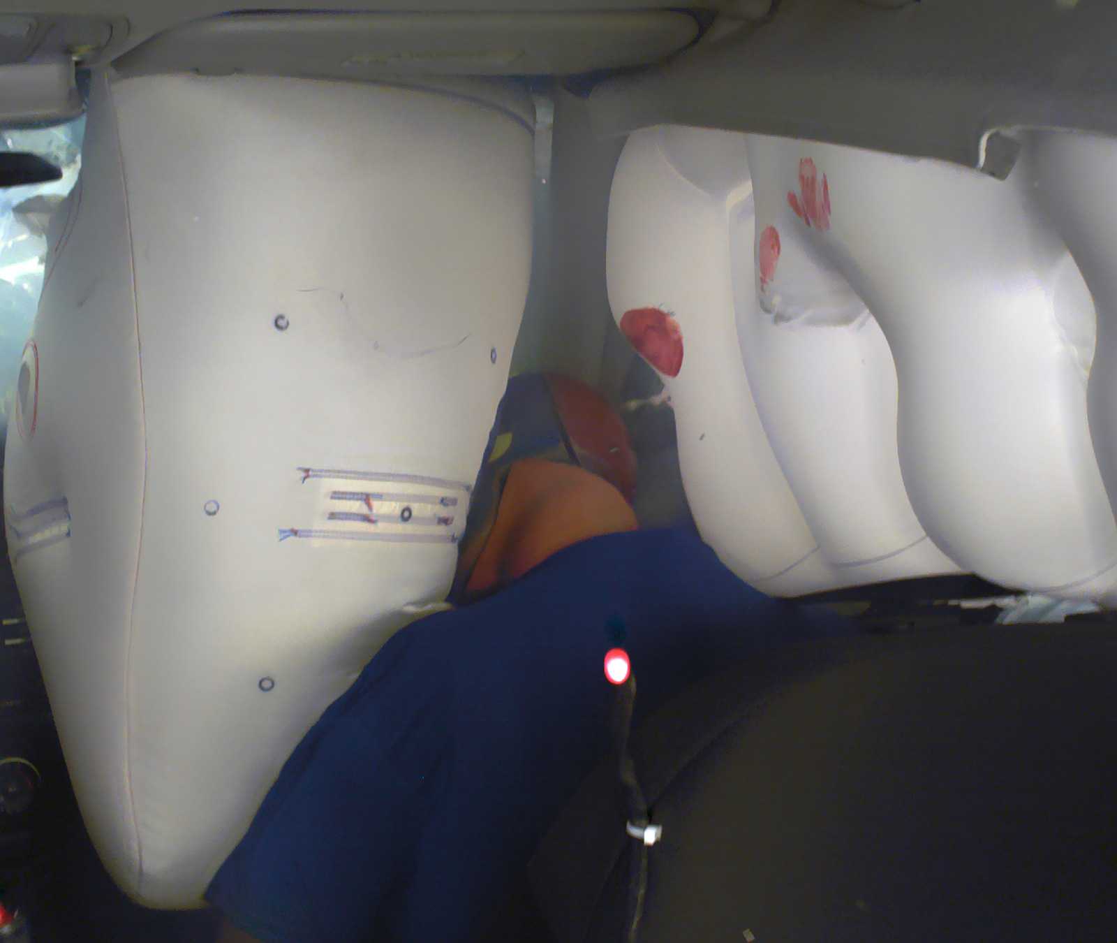 | Passenger restraints and dummy kinematics In both tests, the dummy’s head contacted the frontal airbag but then moved off toward the right side. In the Institute’s test, the head moved so far forward and to the right that it hit the dashboard. The side curtain airbag deployed and has sufficient forward coverage in both tests to protect the head from contact with side structure and outside objects. The side torso airbag also deployed. | M |