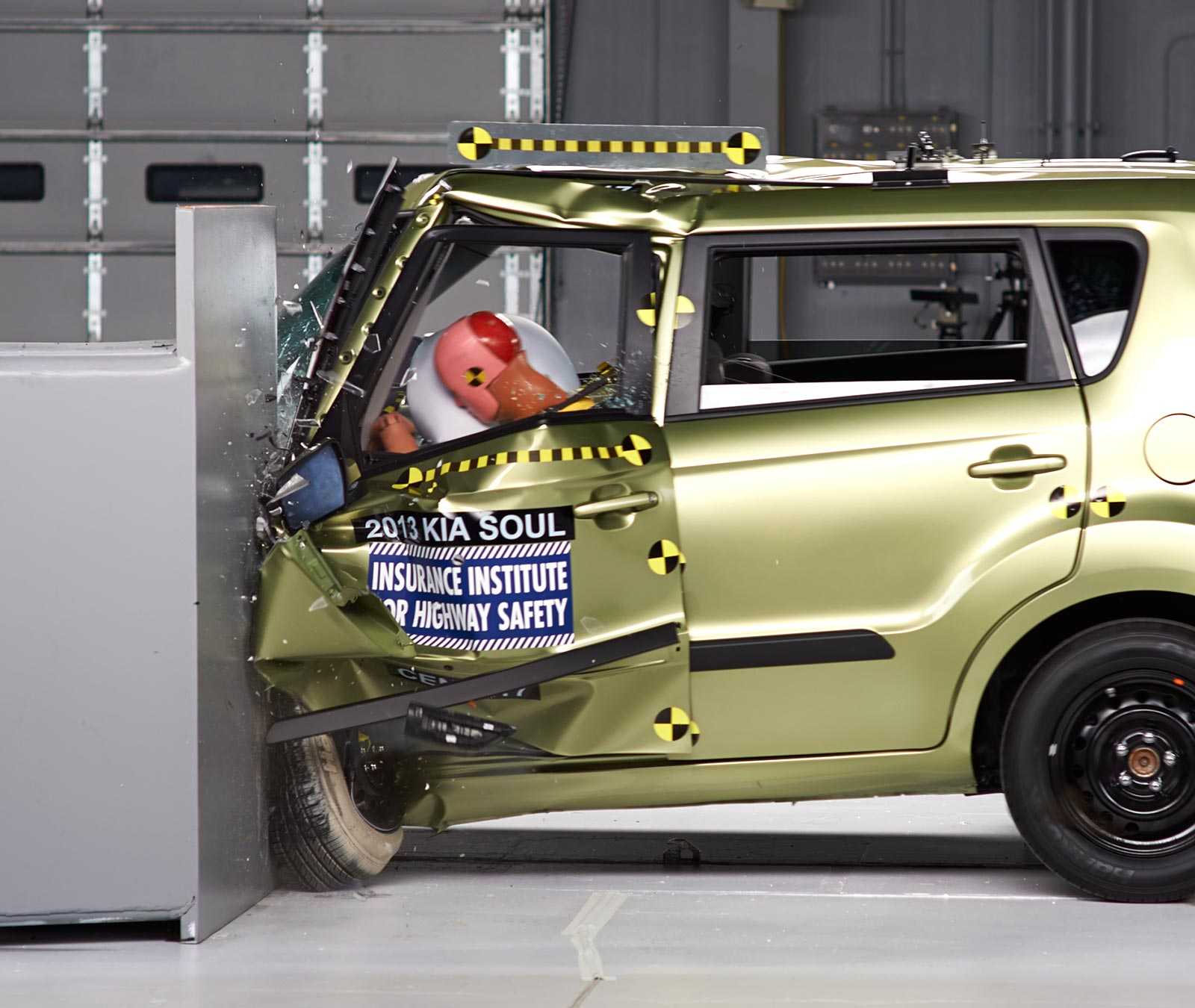 Геометрия салона Kia Soul с ДВС прилично сохранилась при фронтальном ударе, и информация, считанная с датчиков манекенов, показала хорошую защищенность коленей и бедер водителя и пассажира. Однако после осмотра разбитого автомобиля эксперты обнаружили, что передний подрамник сдвинулся назад – это чревато травмами нижней части ног водителя, кроме того, повреждения могут возникнуть при контакте с рулевой колонкой и приборной панелью. Опасность грозит левой ступне и правой ноге водителя ниже колена, а также левому бедру пассажира. Защищенность этих зон отмечена оценкой — marginal, соответствующей нижнему допустимому уровню. Soul прекрасно выдержал тест на боковой удар, имитирующий столкновение с другим автомобилем, а вот при ударе о столб подвела боковая подушка безопасности – защита грудной клетки водителя оказалась слабой (оценка weak).