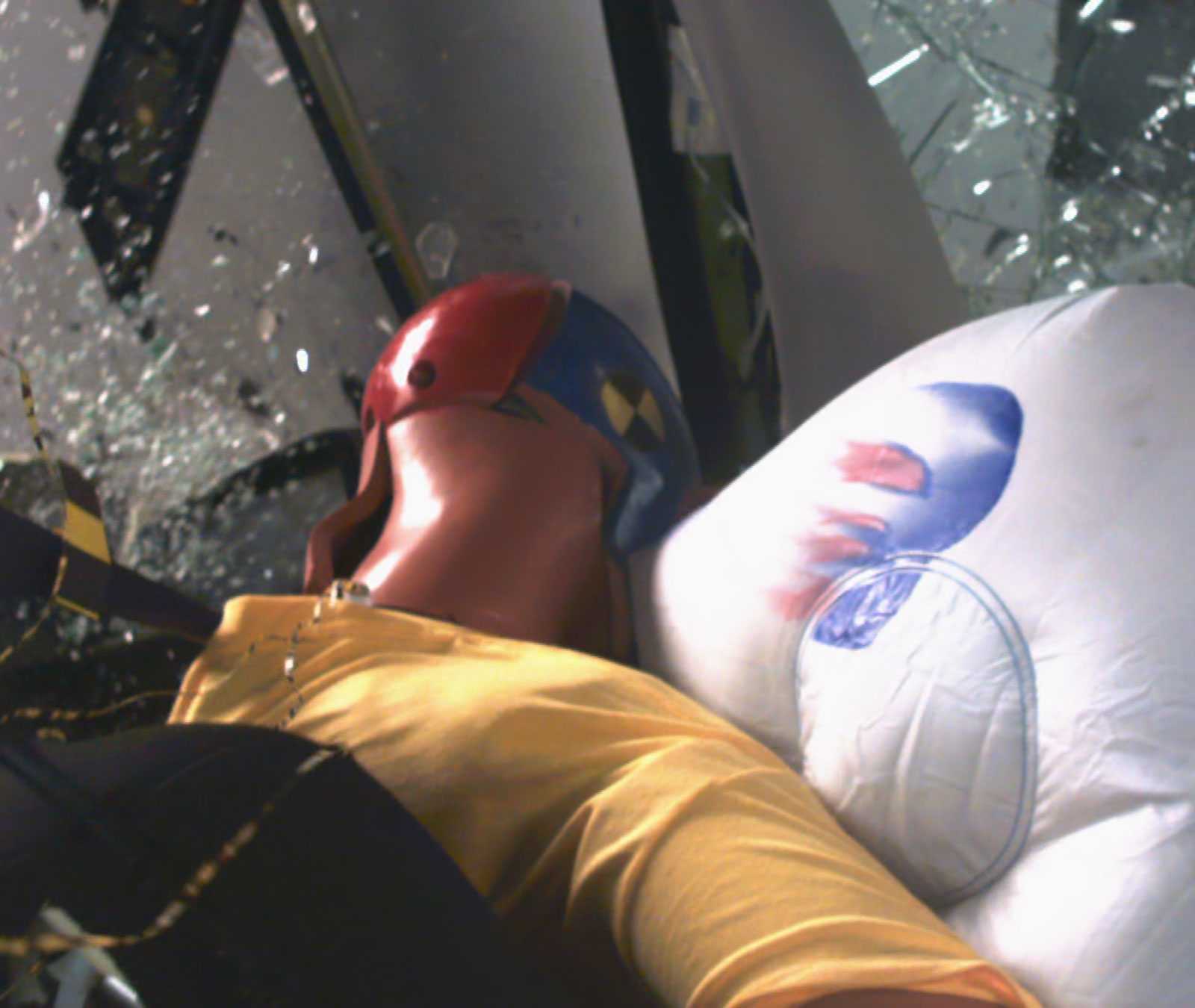 The dummy’s head slid off the right side of the frontal airbag and moved far enough forward to hit the dashboard hard (Institute test shown).
