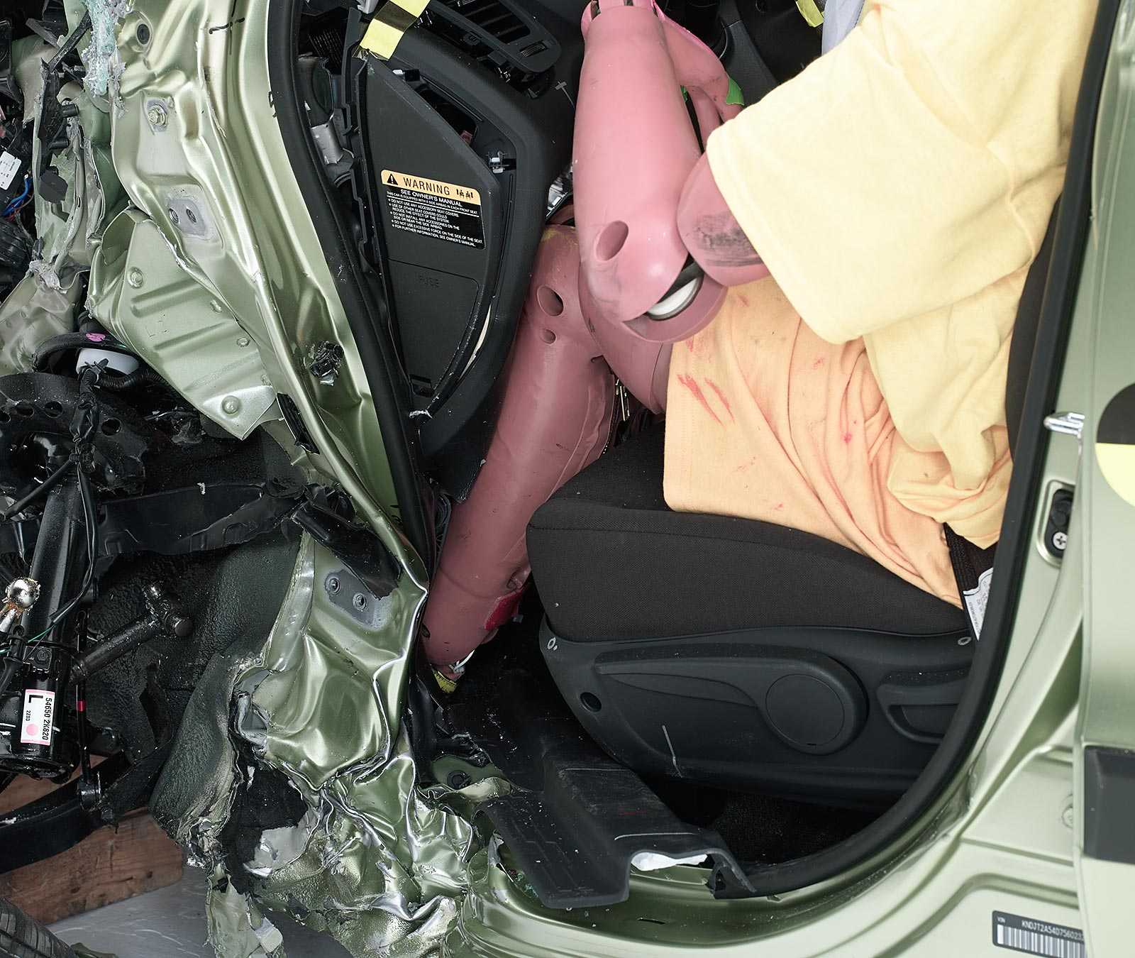 The dummy’s position in relation to the door frame and dashboard after the crash test indicates that the passenger’s survival space was maintained well (Institute test car shown).
