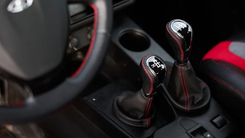 На приборной панели добавилось ярких цветов, в частности красного, которым окантовали стрелки. Селектор КПП, рычаг ручника обшиты кожей.