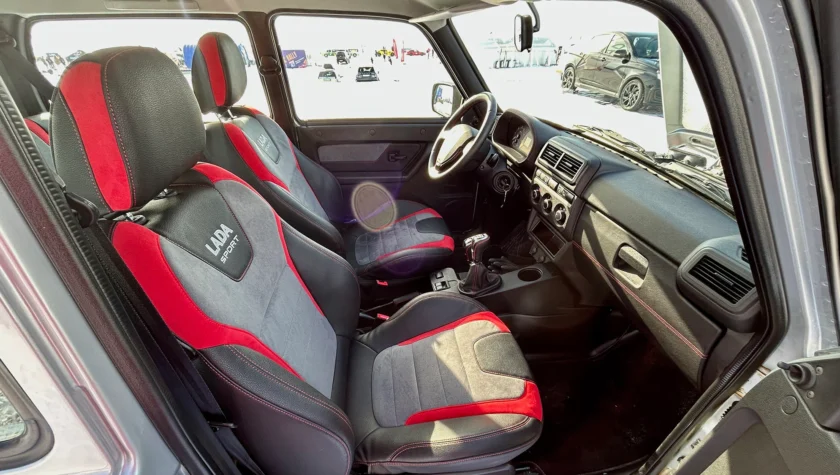 Передний ряд кресел выполнен в спортивном стиле с выраженной боковой поддержкой и регулируемым поясным упором. Вставки сделаны из искусственной замши − алькантары. Интерьер выполнен в черно-серой гамме с красными акцентами. Красная же подсветка присутствует на приборной панели, в ногах и на ручках дверей.