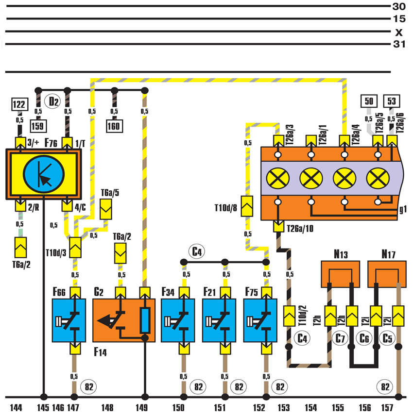 F14 – датчик перегрева охлаждающей жидкости;F21 – датчик усилителя тормозов;F34 – датчик уровня тормозной жидкости;F66 – датчик уровня охлаждающей жидкости;F75 – датчик давления масла в гидросистеме;F76 – электронный термовыключатель;G2 – датчик указателя температуры охлаждающей жидкости;К3 – контрольная лампа давления масла;К28 – контрольная лампа температуры охлаждающей жидкости;К32 – контрольная лампа износа тормозных колодок;К66 – контрольная лампа неисправности блока электронного зажигания;N13 – датчик износа тормозной колодки слева;N17 – пусковая форсунка;T2h – 2-контактный разъем (левая амортизаторная стойка);T2i – 2-контактный разъем (правая амортизаторная стойка);T6a – 6-контактный разъем (черный) за панелью приборов;Т10d – 10-контактный разъем (желтый) за панелью приборов;Т26а – 26-контактный разъем (коричневый) в корпусе панели приборов;82 – соединение с «массой» 1 в переднем жгуте проводов слева.