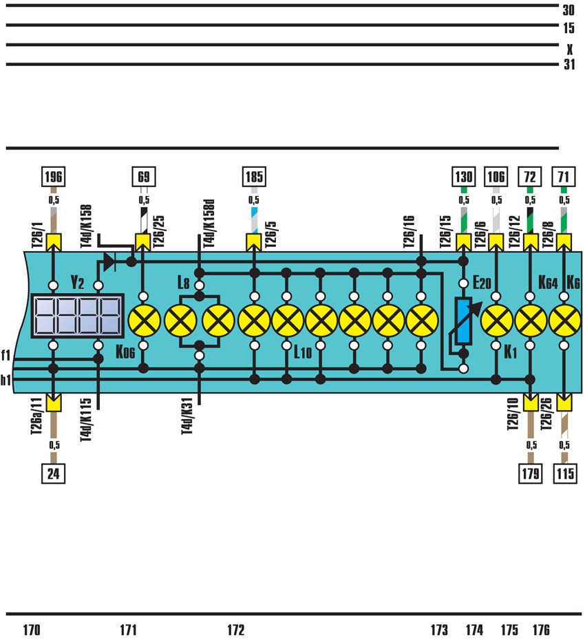 Е20 – регулятор освещения панели приборов;К1 – контрольная лампа фар;К6 – контрольная лампа аварийной сигнализации;К64 – контрольная лампа правого указателя поворотов;К65 – контрольная лампа левого указателя поворотов;L8 – лампа освещения часов; L10 – лампа освещения панели приборов;Т4d – 4-контактный разъем на корпусе панели приборов;Т26–26-контактный разъем (черный) на корпусе панели приборов;Т26а – 26-контактный разъем (коричневый) на корпусе панели приборов;Y2 – электронные часы Ауди 100.