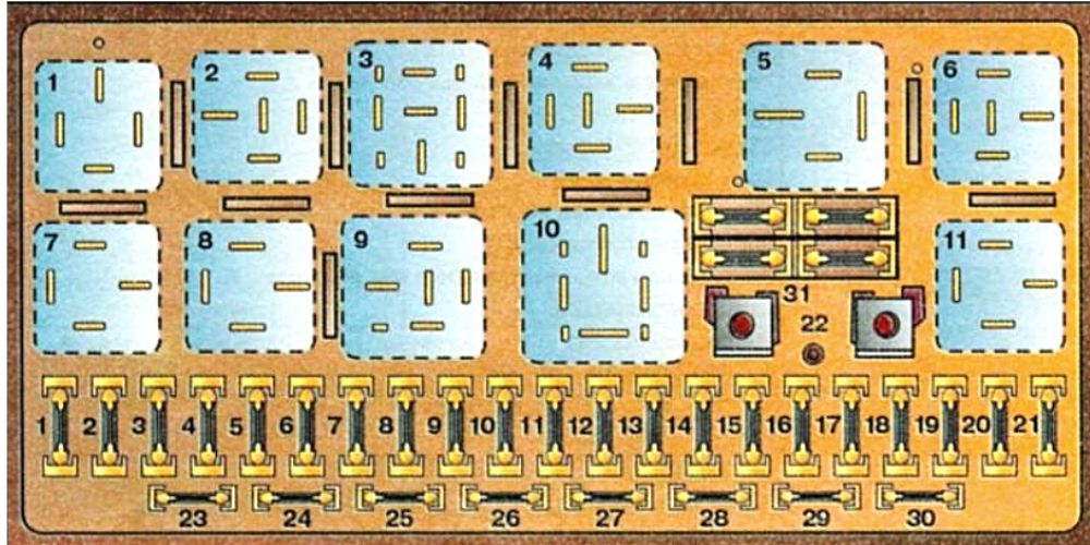 Дополнительные предохранители имеются на блоке реле, дополнительном блоке реле и блоке электроники. Блок реле расположен в салоне автомобиля, с левой стороны под панелью приборов. Блок электроники расположен с левой стороны около перегородки моторного отсека.
