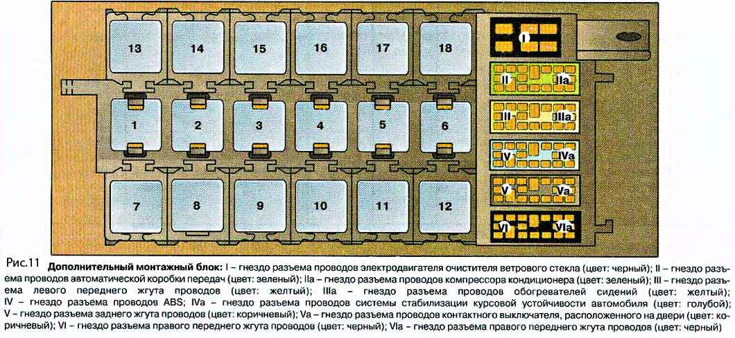 - (15 А) — Часы, освещение багажника, освещение салона, зеркало заднего вида, розетка, прикуриватель, магнитола, бортовой компьютер, блок управления кондиционером