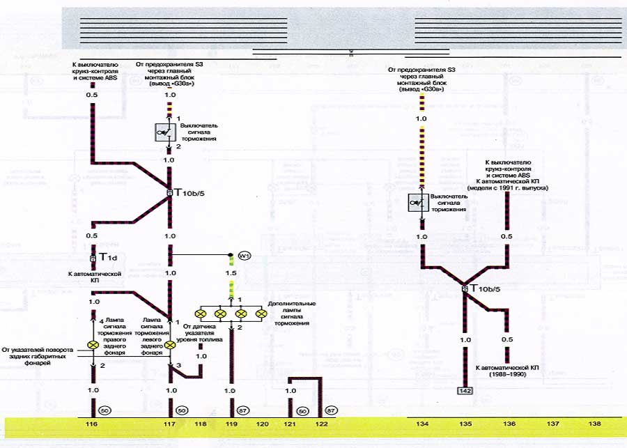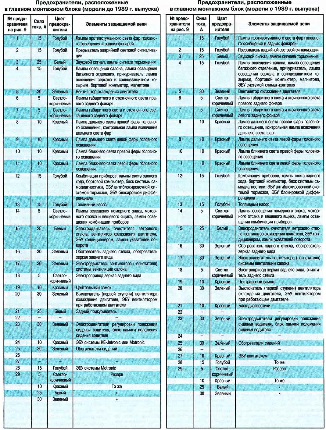 - (15 А) — Приборный щиток, фары заднего света, блокировка дифференциала, система автоматического контроля, система поддержания скорости движения (блок управления), АБС, вентилятор охлаждения блока управления, 4-скоростная автоматическая коробка передач (с 1990 года)