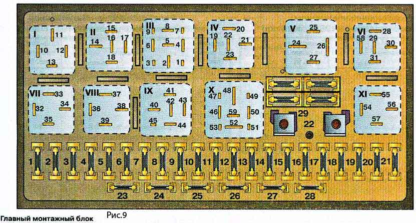- монтажный блок, в котором установлены все реле и предохранительные элементы;